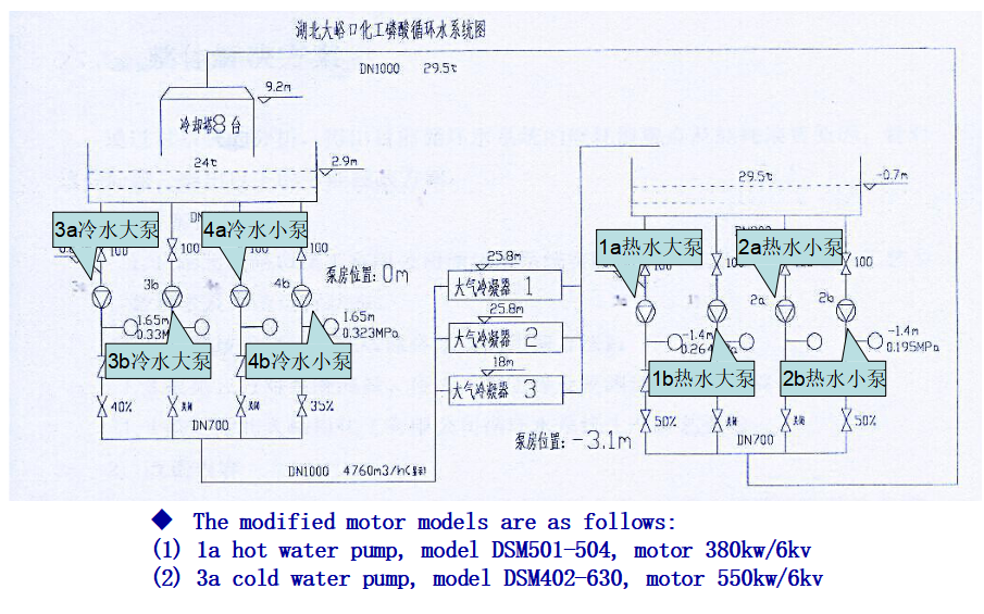 2、 Dayukou Company actively responded to the national call for energy conservation and emission reduction, and carried out energy-saving renovations on its phosphoric acid workshop circulating water system. Several companies have proposed renovation plans before and after. Replace the original pump with a high-performance pump to improve pump efficiency, and renovate its pipeline system. Two energy-saving companies have proposed to renovate the system through energy-saving pumps.